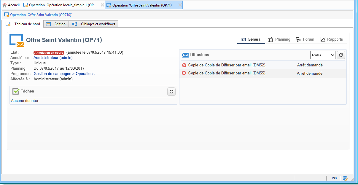 L'annulation de l'opération de référence et l'arrêt de tous les traitements en cours (workflows, diffusions),