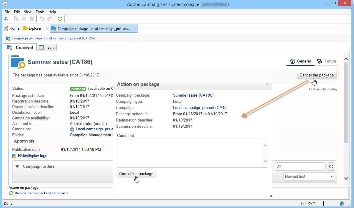 클릭 Cancel 캠페인 패키지에서 Dashboard.