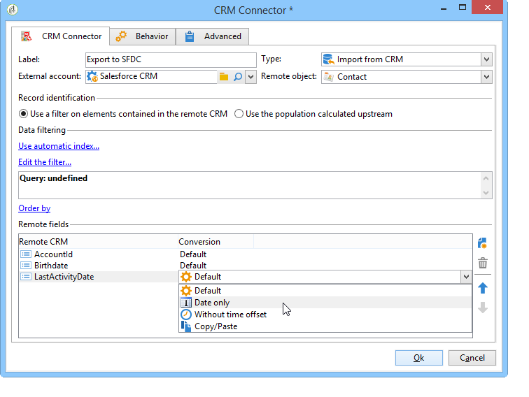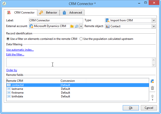 다음 Use automatic index… 옵션을 사용하면 날짜와 마지막 수정 내용에 따라 CRM과 Adobe Campaign 간의 증분 개체 동기화를 자동으로 관리할 수 있습니다.