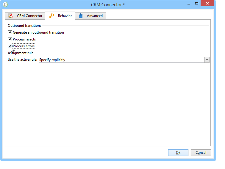 다음 Behavior 탭에서는 거부 처리를 활성화할 수 있습니다. 이 옵션은 CRM connector 활동. 자세한 내용은 처리 오류.