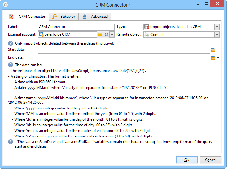 요소 삭제 기간은 CRM에 관련된 제한 사항과 일치해야 합니다. 즉, Salesforce.com의 경우, 예를 들어 30일 전에 삭제된 요소는 복구할 수 없습니다.