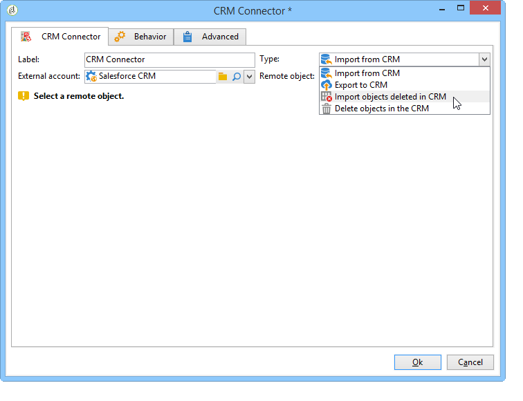 의 내보내기 기능 CRM Connector 활동은 CRM 측에서 필드를 삽입하거나 업데이트할 수 있습니다. CRM에서 필드 업데이트를 활성화하려면 원격 테이블의 기본 키를 지정해야 합니다. 키가 없으면 데이터가 삽입됩니다(업데이트되지 않음).