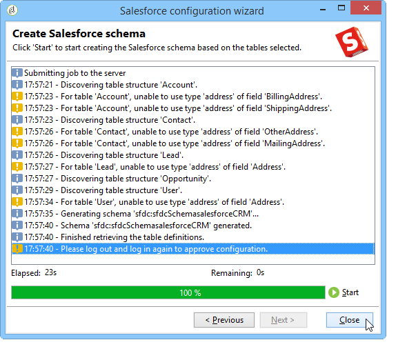 구성 마법사를 실행하여 사용 가능한 CRM 테이블을 생성합니다. 구성 마법사를 사용하여 테이블을 수집하고 일치하는 스키마를 만들 수 있습니다.