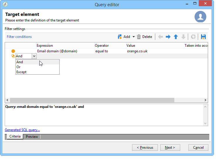 여러 필터링 조건을 사용하는 쿼리의 경우 조건 사이에 링크를 정의해야 합니다. 다음 세 가지 가능한 링크가 있습니다.