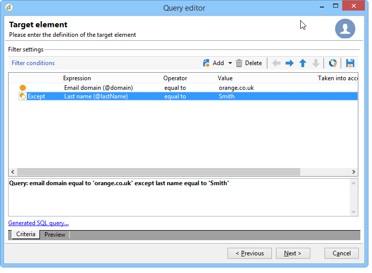 다음 예에서는 수신자의 성이 "Smith"인 경우를 제외하고 이메일 도메인에 "orange.co.uk"이 포함된 수신자를 반환하려고 합니다.