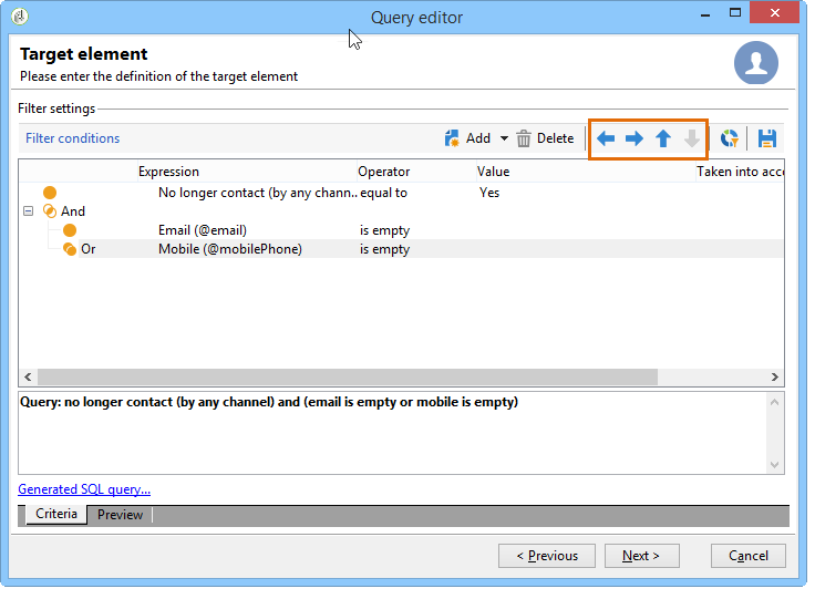 다음 예제에서는 화살표를 사용하여 괄호 레벨을 삭제하는 방법을 보여 줍니다. 다음 필터링 조건에서 시작합니다. City equal to London OR gender equal to male and mobile not indicated OR account # starts with “95” and company name starts with “A”.
