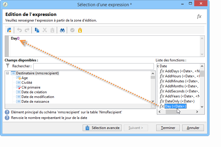 Il vous permet de sélectionner des champs dans les tables de base de données et de leur associer des fonctions avancées : sélectionnez la fonction à utiliser dans la liste des fonctions. Les fonctions disponibles sont présentées dans la liste des fonctions. Ensuite, sélectionnez les champs concernés par les fonctions et cliquez sur OK pour valider l’expression.