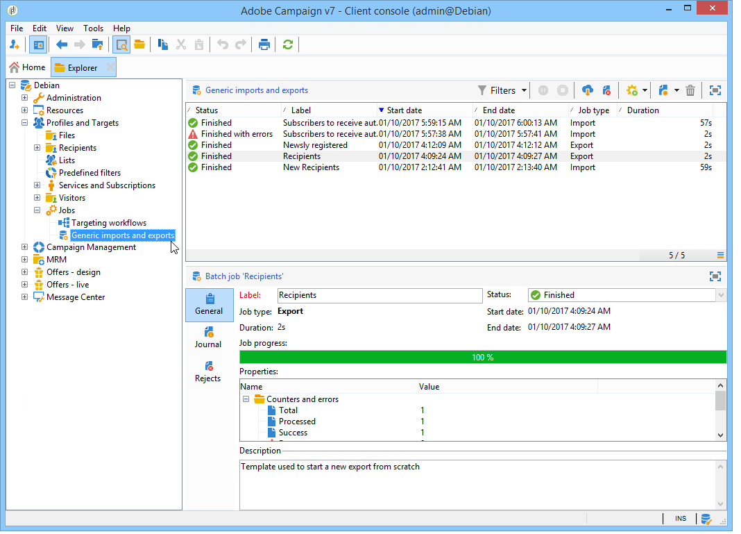 마지막으로 Adobe Campaign 탐색기에서 가져오기 및 내보내기를 시작할 수 있습니다.
