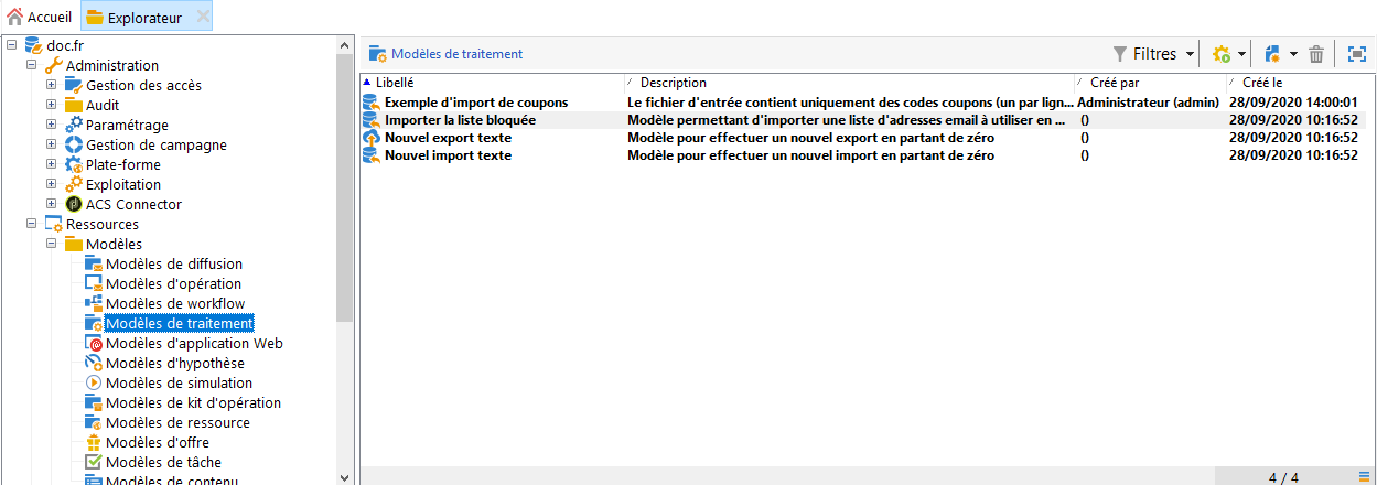 Les modèles d'import et d'export sont stockés dans le répertoire Ressources > Modèles > Modèles de traitement de l'arborescence d'Adobe Campaign.