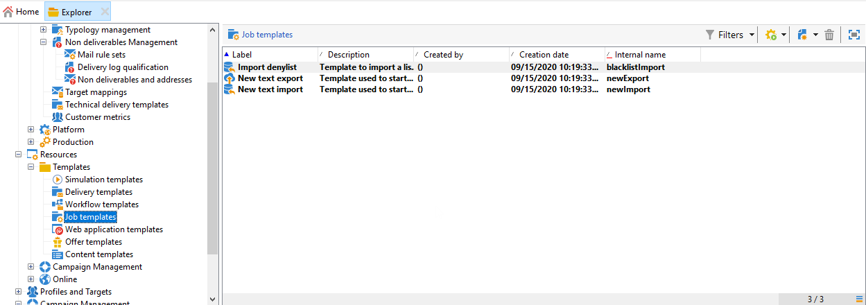 가져오기 및 내보내기 템플릿은 Resources > Templates > Job templates Adobe Campaign 트리의 디렉토리입니다.