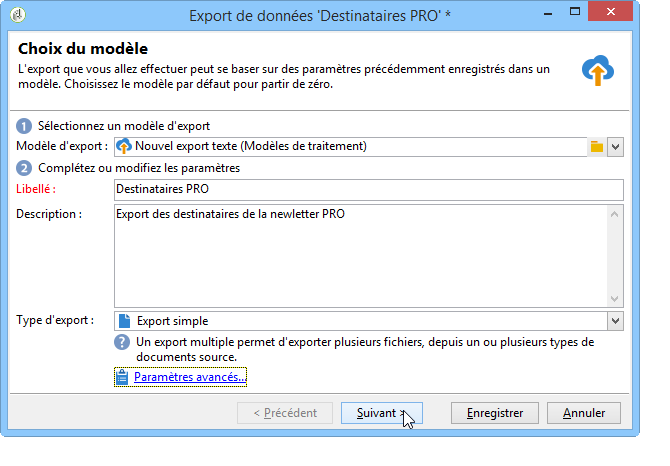 Lorsque vous lancez l'assistant d'export, vous devez d'abord sélectionner un modèle. A titre d'exemple, pour configurer l'export des destinataires qui se sont récemment inscrits, procédez comme suit :