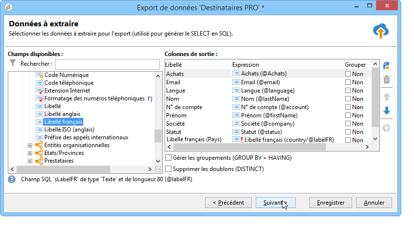 Double-cliquez sur les champs de votre choix dans la liste Champs disponibles afin de les ajouter à la section Colonnes de sortie.