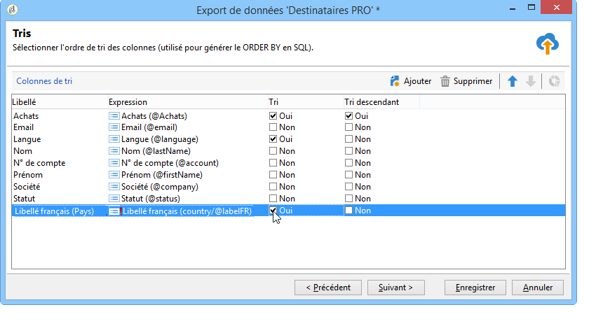 Pour changer l'ordre des colonnes à exporter, sélectionnez la colonne concernée et utilisez les flèches bleues situées à droite du tableau.