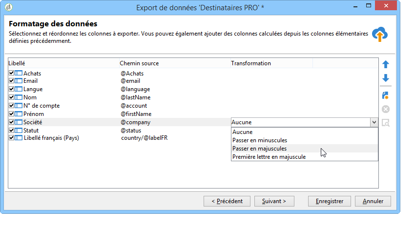 Pour appliquer une transformation de casse au contenu d'un champ, sélectionnez-la depuis la colonne Transformation. Vous pouvez choisir :