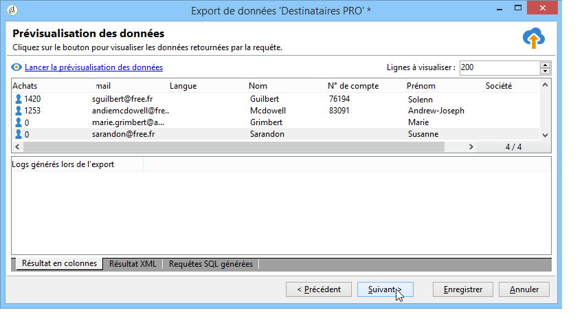 Cliquez sur Lancer la prévisualisation des données pour avoir un aperçu du résultat de l'export. Par défaut, les 200 premières lignes sont affichées. Cliquez sur les flèches à droite du champ Lignes à visualiser pour modifier cette valeur.
