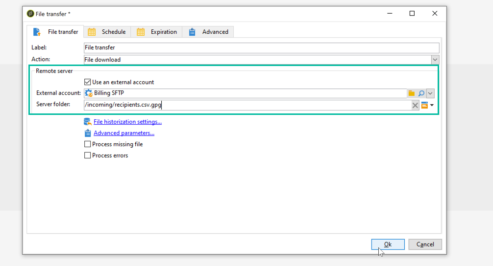 File transfer 활동을 연 다음 암호화된 .gpg 파일을 가져올 외부 계정을 지정합니다.