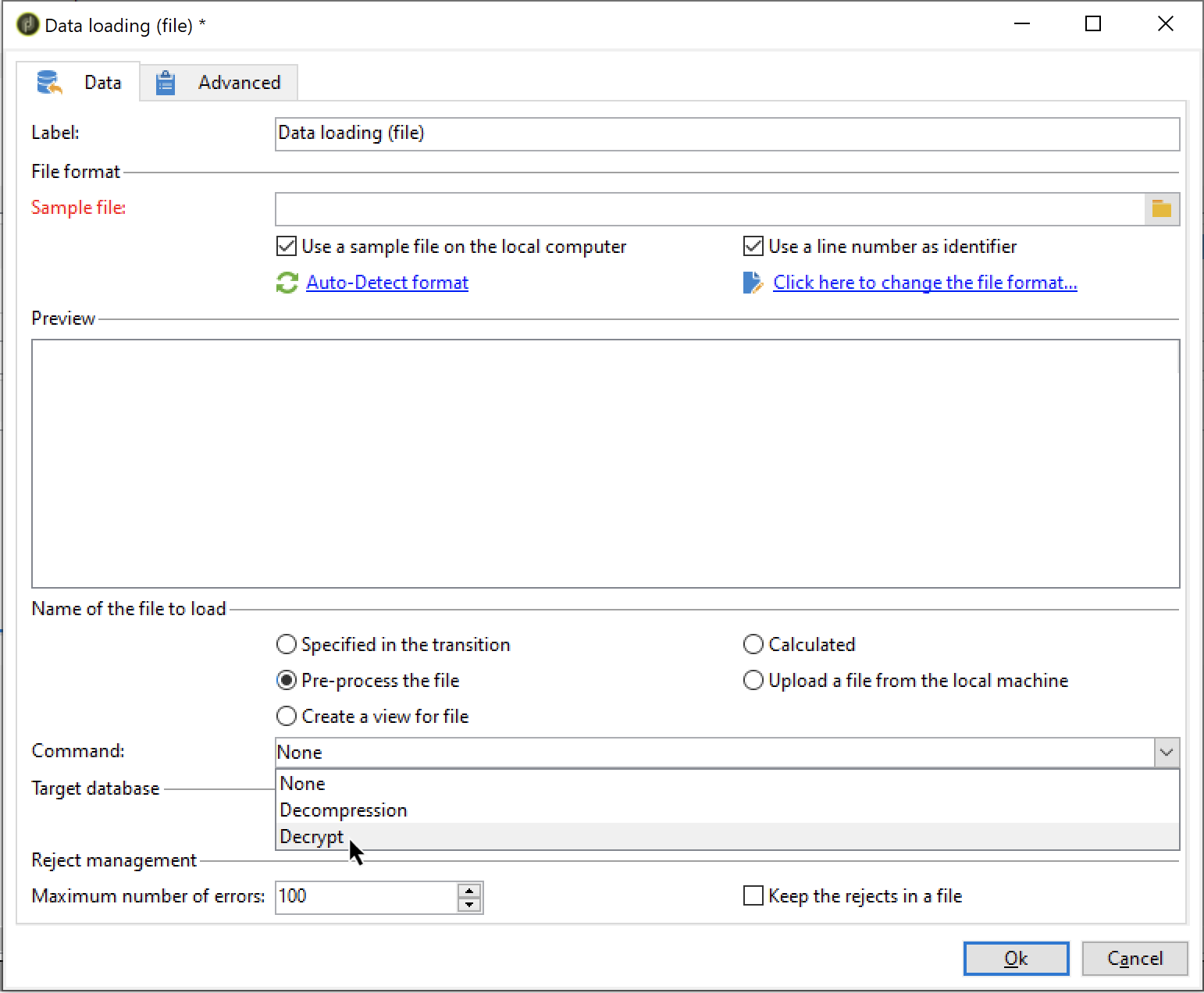 들어오는 데이터를 해독하기 위해 활동에 전처리 단계를 추가합니다. 이렇게 하려면 Pre-process the file 옵션을 선택한 다음 Decrypt 드롭다운 목록에서 Command을(를) 선택합니다.