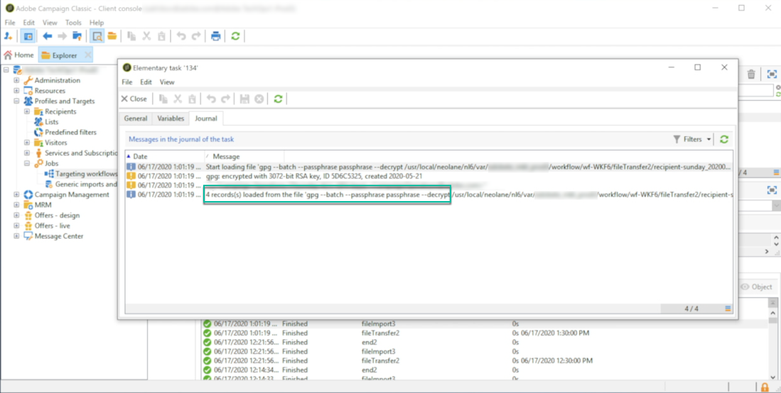 - Data loading (file) 활동: 파일에서 데이터베이스로 데이터를 로드하고 Campaign 컨트롤 패널에서 생성된 개인 키를 사용하여 암호를 해독합니다.