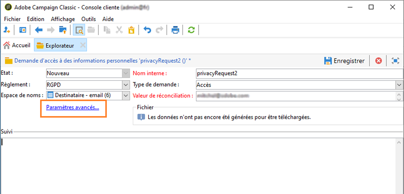 L'interface d'Adobe Campaign permet de créer des demandes d'accès à des informations personnelles et de suivre leur évolution. Pour créer une demande d'accès à des informations personnelles, procédez comme suit :