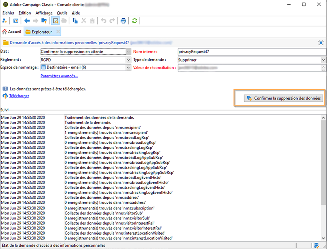 Le processus en 2 étapes est activé par défaut. Lorsque vous créez une demande de suppression à l'aide de ce mode, Adobe Campaign effectue toujours en premier une demande d'accès. Vous pouvez ainsi vérifier les données avant de confirmer la suppression.