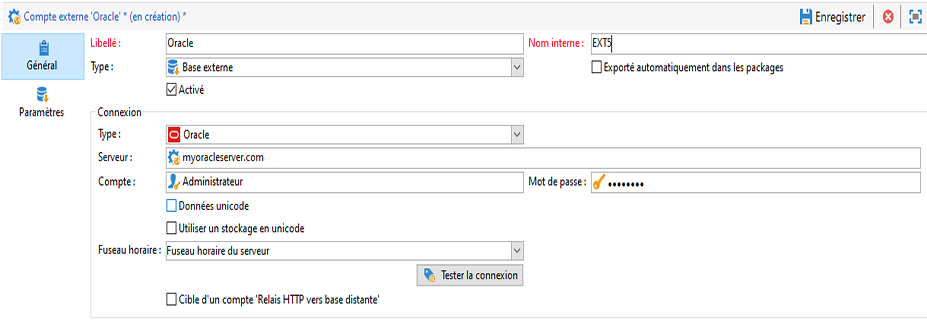 Pour configurer le compte externe Oracle, vous devez indiquer les informations suivantes :