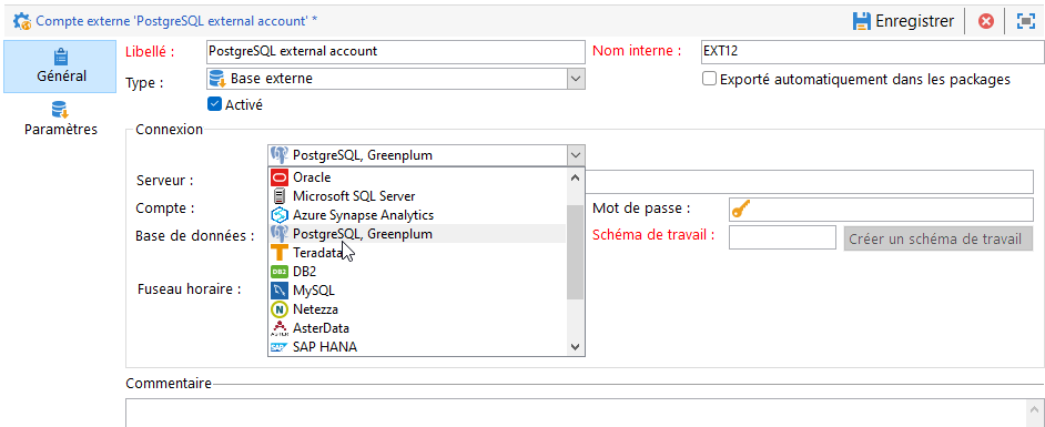 Dans Adobe Campaign, vous pouvez ensuite configurer votre compte externe PostgreSQL. Pour plus d'informations sur la configuration de votre compte externe, voir cette section.