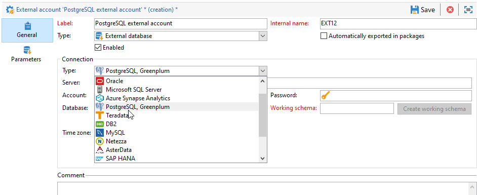 External database을(를) 외부 계정의 Type(으)로 선택합니다.