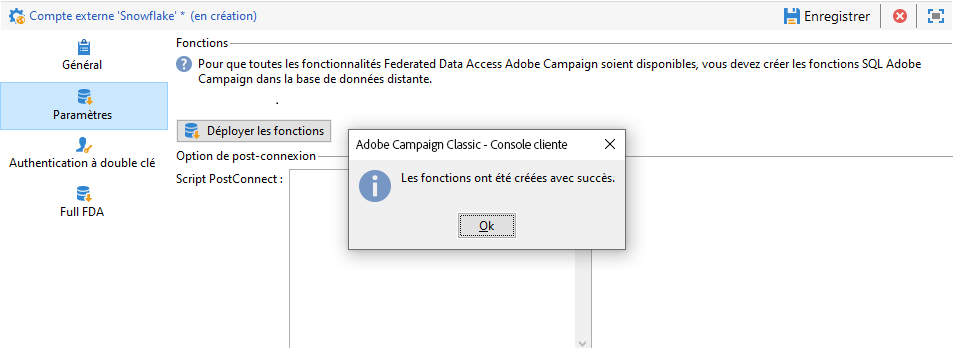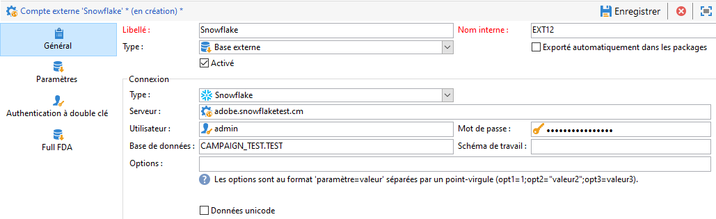 Dans Campaign, vous pouvez ensuite configurer votre compte externe Snowflake. Pour plus d’informations sur la configuration de votre compte externe, voir cette section.