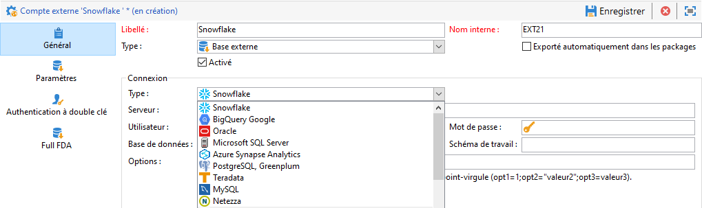 Sous Configuration, sélectionnez Snowflake dans le menu déroulant Type.