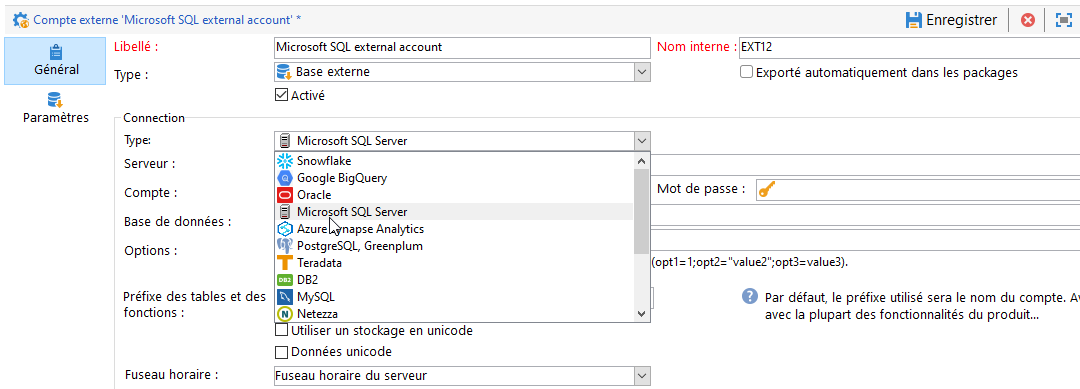 Fuseau horaire : fuseau horaire défini dans Microsoft SQL Server. En savoir plus