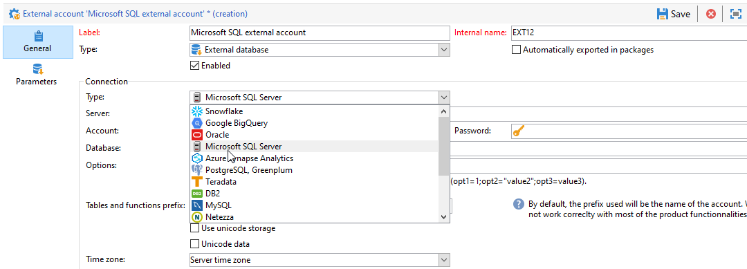 그런 다음 Adobe Campaign에서 Microsoft SQL Server 외부 계정. 외부 계정을 구성하는 방법에 대한 자세한 내용은 이 섹션.