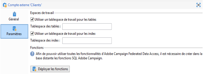 Pour permettre à Adobe Campaign d'accéder à cette base, vous devez déployer les fonctions SQL. Cliquez sur l'onglet Paramètres puis sur le bouton Déployer les fonctions.