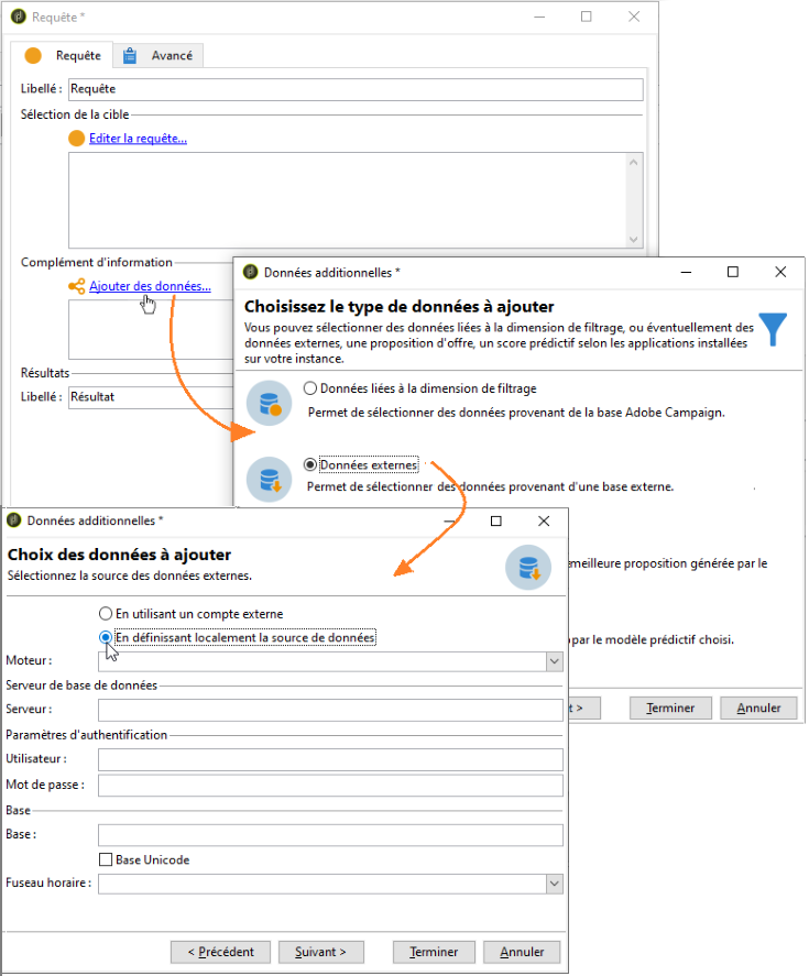 Vous pouvez définir directement une connexion à une base externe à partir des activités d'un workflow. Dans ce cas, il s'agira d'une base externe locale, réservée à une utilisation dans le cadre du workflow courant : elle ne sera pas enregistrée dans les comptes externes. Ce type de connexion ponctuelle peut être créée dans différentes activités du workflow, notamment l'activité de Requête, l'activité de Chargement (SGBD), l'activité d'Enrichissement ou l'activité de Partage.