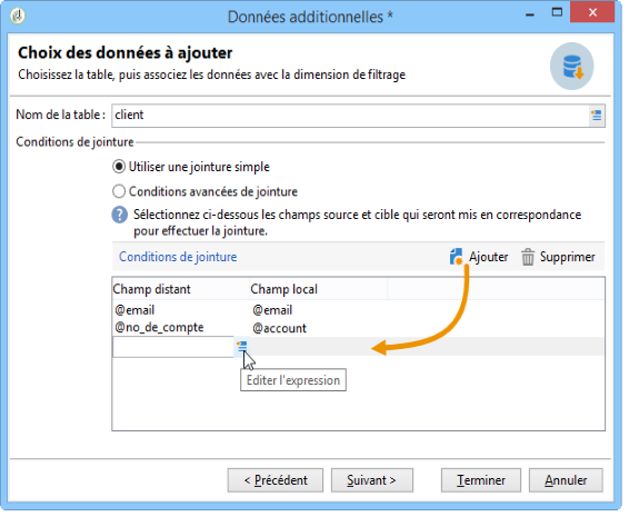 Cliquez sur le bouton Ajouter pour définir un ou plusieurs champs de réconciliation entre les données de la base externe et celles de la base Adobe Campaign. Les icônes Editer l'expression des colonnes Champ distant et Champ local permettent d'accéder à la liste des champs de chacune des tables.