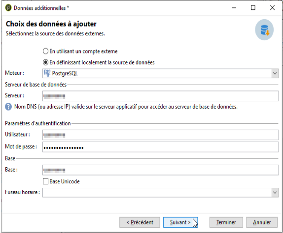 Pour permettre la connexion à la base de données externe, vous devez indiquer les paramètres de connexion, c'est-à-dire la source de données visée et le nom de la table dont les données doivent être chargées.