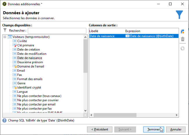 Sélectionnez les données additionnelles à collecter dans la base externe. Pour cela, double-cliquez sur le ou les champs à ajouter afin de les afficher parmi les Colonnes de sortie.