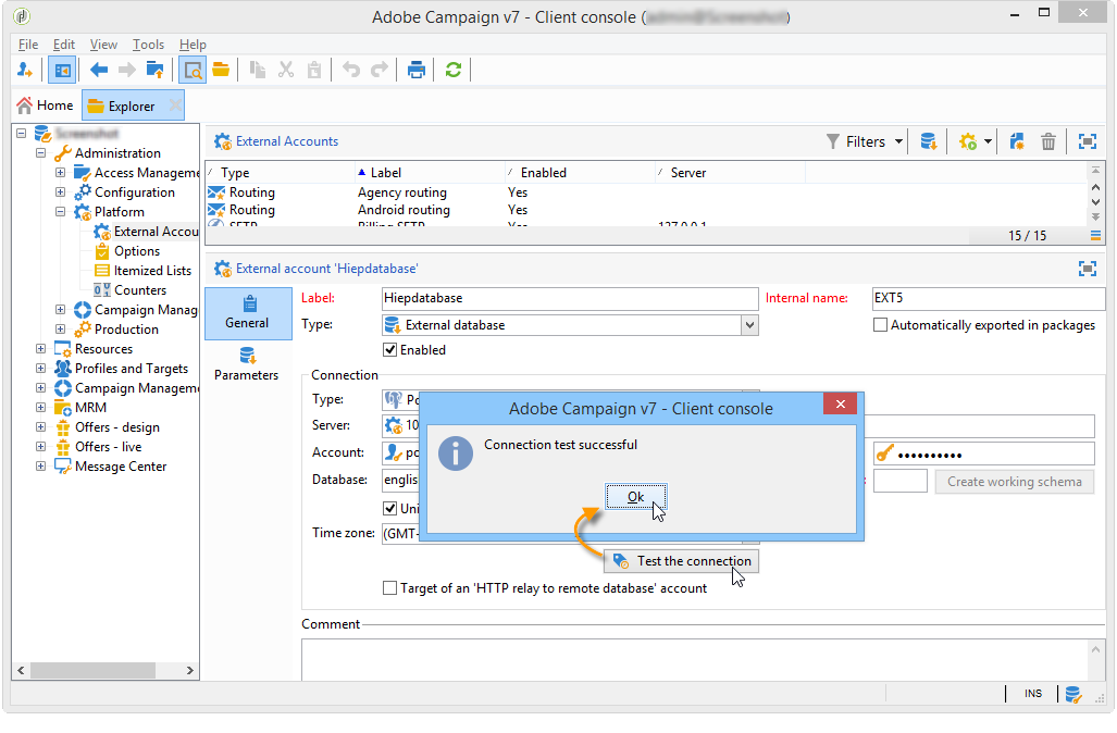 공유 외부 데이터베이스에 대한 연결을 활성화하려면 이 연결이 활성화된 경우 Adobe Campaign을 통해 데이터베이스에 액세스할 수 있습니다.