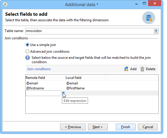 을(를) 클릭합니다. Add 외부 데이터베이스 데이터와 Adobe Campaign 데이터베이스의 데이터 간에 하나 또는 여러 개의 조정 필드를 정의하는 단추입니다. 다음 Edit expression 아이콘 Remote field 및 Local field 각 테이블의 필드 목록에 액세스할 수 있습니다.