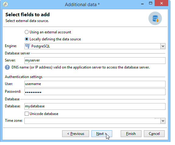 워크플로우 활동에서 외부 데이터베이스에 대한 연결을 직접 정의할 수 있습니다. 이 경우 현재 워크플로우 내에서 사용하도록 예약된 로컬 외부 데이터베이스에 있습니다. 외부 계정에는 저장되지 않습니다. 이러한 유형의 정확한 시간 연결은 워크플로우의 다양한 활동, 특히 Query, Data loading (RDBMS), Enrichment 활동 또는 Split 활동.