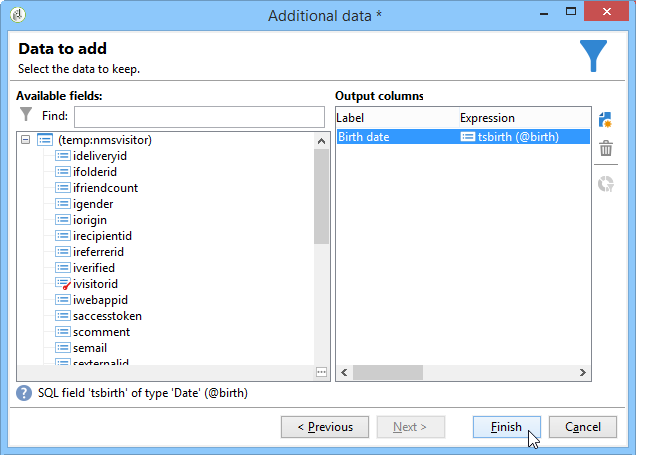 외부 데이터베이스에서 수집할 추가 데이터를 선택합니다. 이렇게 하려면 추가할 필드를 두 번 클릭하여 을 Output columns.