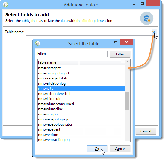 해당 필드에 직접 테이블 이름을 입력하거나 편집 아이콘을 눌러 데이터베이스 테이블 목록에 액세스할 수 있습니다.