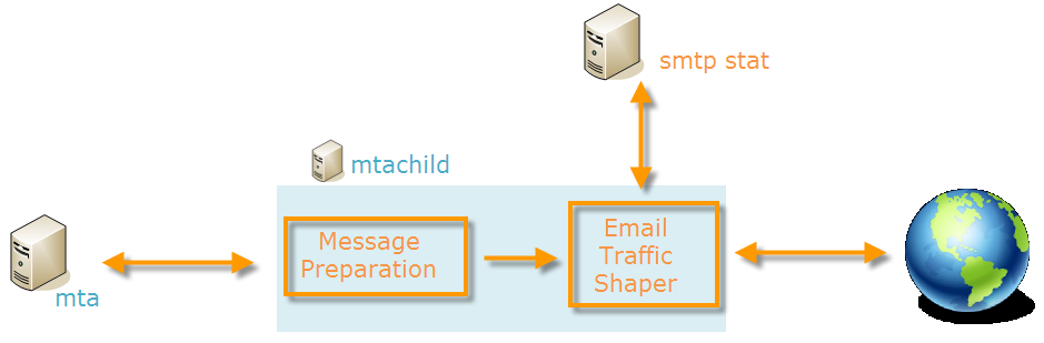 다음 mta 모듈은 메시지를 mtachild 하위 모듈입니다. 각 mtachild 통계 서버에서 인증을 요청하고 보내기 전에 메시지를 준비합니다.