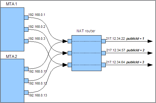 소스 IP 주소는 공용 IP 주소(원격 이메일 서버에서 보는 주소)와 일치합니다. 이 IP 주소는 mta NAT 라우터가 제공된 경우 통계 서버에서 공용 IP(publicId). 로컬 주소와 이 식별자 간의 연결은 serverConf.xml 구성 파일. 에서 사용할 수 있는 모든 매개 변수 serverConf.xml 여기에 나열되어 있습니다. 섹션.