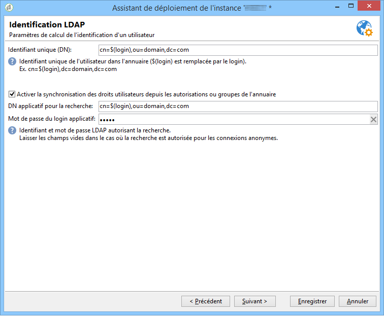 La configuration LDAP est réalisée dans l'assistant de déploiement. L'option Intégration LDAP doit être sélectionnée dans la première étape de configuration. Pour plus d'informations, consultez la section Assistant de déploiement.
