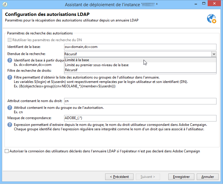 Les noms des groupes dans l'annuaire LDAP doivent correspondre aux noms des groupes dans Adobe Campaign. Leur masque d'association est défini dans la dernière étape de configuration de l'assistant de déploiement, par exemple : Adobe Campaign_(.*).