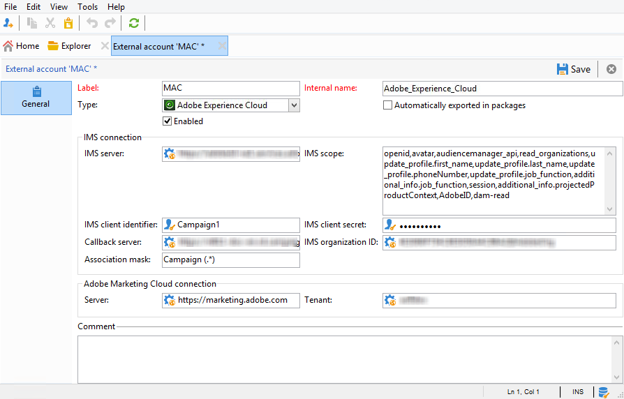 사용된 IMS 서버에 대한 연결 정보(ID 및 암호)입니다. 이 정보는 Adobe 지원을 통해 제공됩니다. 자세한 내용은 Adobe Experience Cloud 관리자를 위한 FAQ.