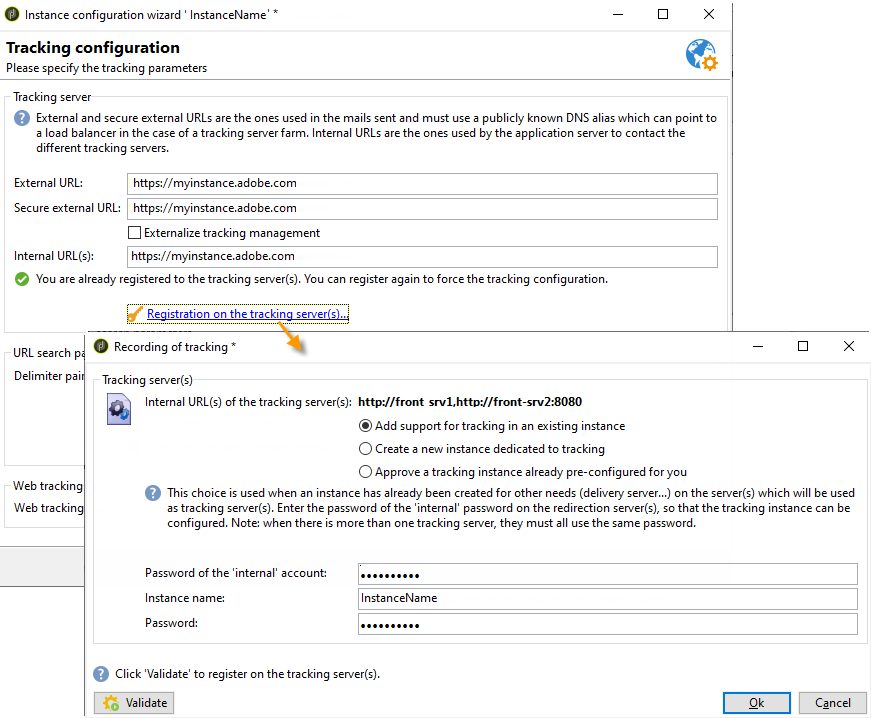 Tracking: Populate the external URL used for redirection and the internal URL, click Registration on the tracking server(s) and then validate it on the demo instance of the tracking server.