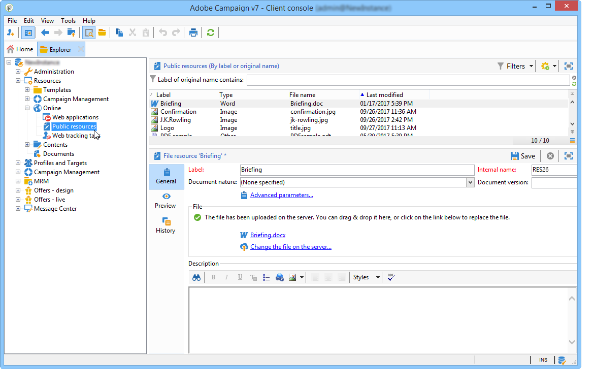 공개 리소스는 관리 > 리소스 > 온라인 > 공용 리소스 노드 아래에 나열된 상태로 남아 있습니다. 라이브러리로 수집되고 이메일에 포함할 수 있지만 캠페인이나 작업, 콘텐츠 관리에도 사용됩니다.