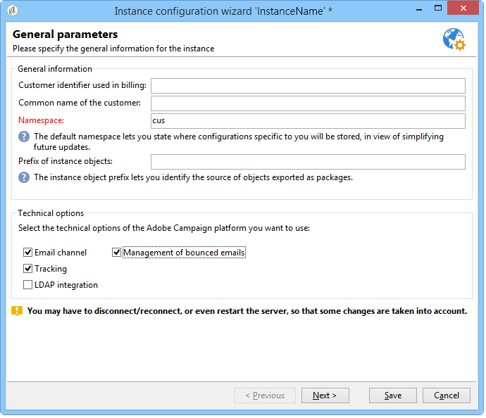 Adobe Campaign 클라이언트 콘솔에서 사용할 수 있는 그래픽 마법사를 사용하여 연결할 인스턴스의 매개 변수를 정의할 수 있습니다.