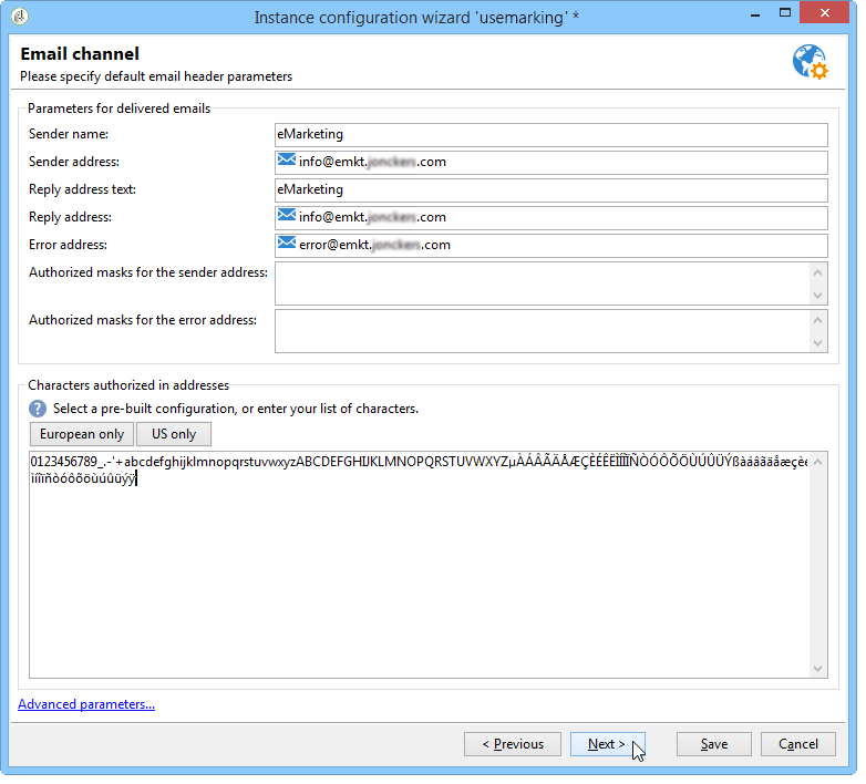 이 외에도 마스크 발신자 주소 및 오류 주소에 대해 인증됨. 필요한 경우 쉼표를 사용하여 마스크를 분리할 수 있습니다. 이 구성은 선택 사항입니다. 필드를 입력하면 Adobe Campaign은 배달 시(주소에 변수가 포함되어 있지 않은 경우 분석 중에) 주소가 유효한지 확인합니다. 이 운영 모드에서는 배달 문제를 트리거할 수 있는 주소가 사용되지 않습니다. 게재 주소는 게재 서버에서 구성해야 합니다.